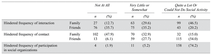 Social activity was assessed using the frequency of interaction with family and friends, as well as the frequency of participation in community activities. Choices for frequency of interaction with family and friends and of participation were: “almost every day,” “two to three times per week,” “once per week,” “once or twice per month,” “several times per year,” “hardly ever,” and “do not have family or friends.” Responses of “almost every day,” “two to three times per week,” and “once per week” were combined into a “high frequency” category, while “once or twice per month” and “several times per year” were combined into a “low frequency” category, and “hardly ever,” “no social participation,” and “do not have family or friends” were combined into a “none” category.