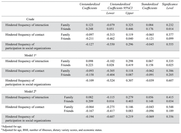 Table 3 shows the association between social activities and frailty score. A significant association was found between hindered interaction with friends and frailty score (β: 0.176, p = .014). This association was also found to be significant in both Model 1, which was adjusted for age (β: 0.158, p = .025), and Model 2, which was adjusted for age, BMI, number of illnesses, dietary variety score, and economic status (β: 0.148, p = .034). No significant association was found between hindrance of other social activities and frailty.