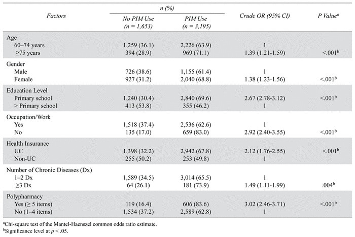 The prevalence of PIM use in 4,848 older patients was 65.9%. When comparing the two age groups, those aged ≥75 years had a higher prevalence of PIMs use as compared to those aged between 60–74 years; the prevalence of PIMs was 71.1% in patients aged 75 and older and 63.9% in patients aged 60 to 75. Females tended to have a higher frequency of PIM than males. Older patients who were educated only to primary school level had a higher prevalence (69.6%) than those with a higher level of education (46.2%). Patients who were unemployed were more likely to have been prescribed PIMs than those who had an occupation (83.0% and 62.6%, respectively). 67.8% of UC patients were prescribed with PIMs, and 73.9% of them had ≥3 chronic diseases. Most patients (83.6%) with polypharmacy had being prescribed PIMs. The factors that had a significant influence on PIM use were: age ≥75 years, educational level, occupation, UC health insurance, NCDs ≥3 diseases, and polypharmacy. These are shown in Table 2.