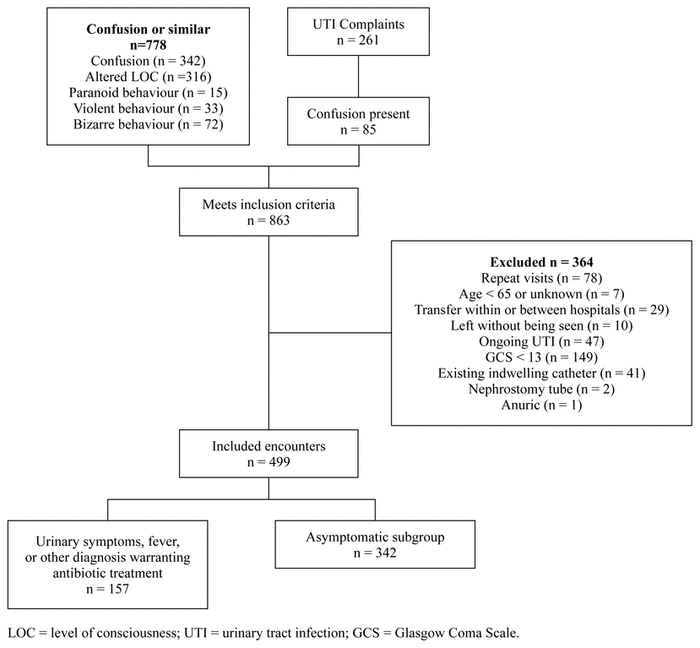 This was a cross-sectional retrospective health record review of adults aged 65 or older presenting to two EDs of an academic tertiary-care hospital in Ottawa, Ontario from January 15th to July 30th, 2018. These EDs have a combined 180,000 annual visits. The Ottawa Hospital’s Data Warehouse identified charts for patients with an ED triage tracking chief complaint of “altered level of consciousness,” “bizarre behaviour,” “confusion,” “paranoid behaviour,” or “violent behaviour.” In addition, patient encounters with an ED tracking chief complaints of “UTI complaints” were reviewed to identify additional patients presenting with confusion, delirium, or similar. In our clinical experience, older patients (or family) may report presumed UTI as the chief complaint rather than the actual confusional state that the patient is experiencing. Patients who presented repeatedly to the emergency department within the study period were only included once, on their first visit. Patients who had been transferred between or within hospitals were excluded because it was not possible to determine which investigations had already been performed. Patients with a Glasgow Coma Scale less than 13 were also excluded, as this could preclude assessment of urinary symptoms and may indicate other moderate-to-severe brain pathologies outside the scope of this study.(27) Additionally, patients with any of the following conditions were excluded: left without being seen, current treatment for UTI, indwelling catheters, nephrostomy tubes or anuria. The study was approved by the Research Ethics Board of The Ottawa Hospital Research Institute.