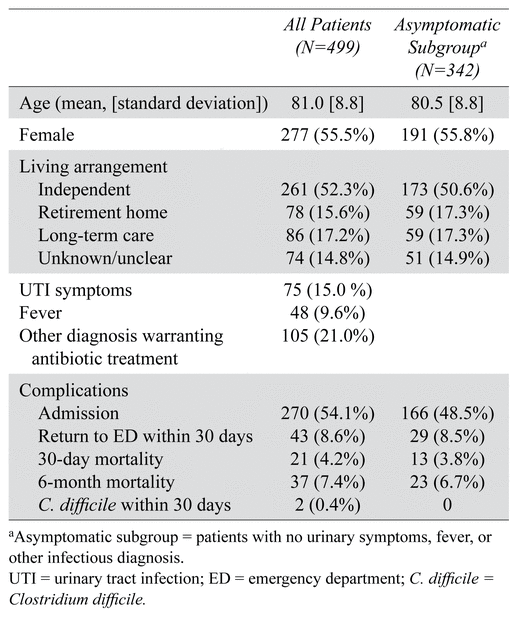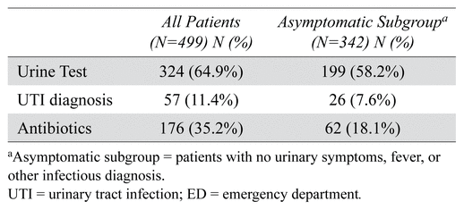 The study flow diagram is illustrated in Figure 1. Data warehouse identified 1,039 eligible encounters during the study period. From this, 540 encounters were excluded, leaving 499 in the final analysis. Of these patients, 157 had UTI symptoms, fever or a diagnosis other than UTI warranting antibiotics. The asymptomatic subgroup consisted of the remaining 342 patients (68.5% of total encounters) who had none of these three criteria. Other demographic and clinical features of these patients are presented in Table 1.