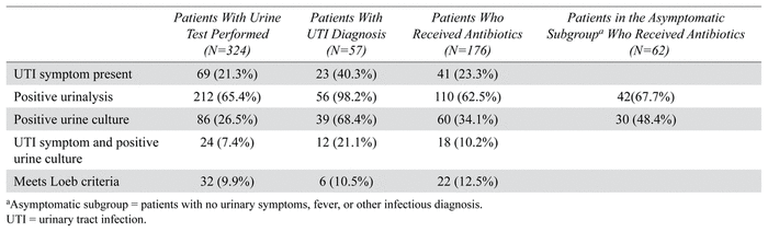 The primary outcome was the proportion of patients who received urine tests, UTI diagnosis, and antibiotic treatment. Secondary outcomes included correlations between presenting symptoms, demographic factors and the rate of urine testing, and the association between antibiotic prescription and negative outcomes ( C. difficile infection, admission to hospital, return to hospital within 30 days, 30-day and six-month mortality).