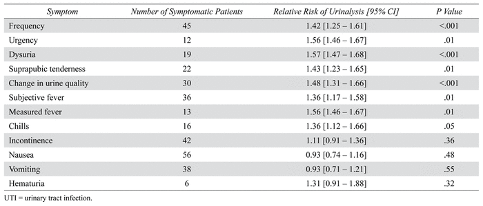 Relative risk of UTI investigation in patients with potential UTI symptoms or signs (vs. absence of the symptom)