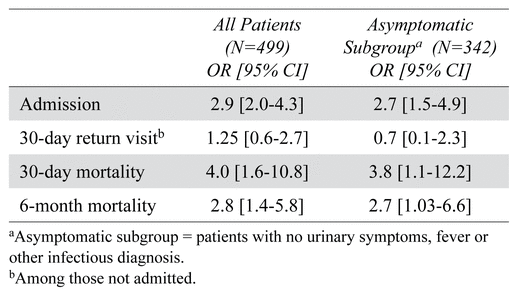 We observed higher rates of admission and mortality among those who received antibiotic treatment both in the entire cohort and in the asymptomatic subgroup (Table 5). In the asymptomatic subgroup where antibiotics are presumably given for suspected UTI based on confusion, odds ratios (95% CI) for admission, and 30-day and six-month mortality were 2.7 (1.5–4.9), 3.8 (1.1–12.2), and 2.7 (1.03–6.6), respectively, after adjusting for age and sex. There was no statistically significant association between antibiotic use and prevalence of return to ED within 30 days. There were only two cases of positive Clostridium difficile assays within 30 days of presentation among all cases (one in a patient who did and one who did not receive antibiotics), and no further statistical analysis was performed.