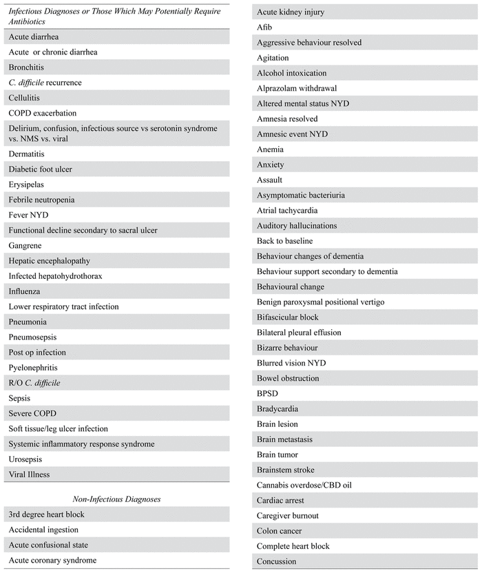 1 Loeb M, Bentley DW, Bradley S, et al. Development of minimum criteria for the initiation of antibiotics in residents of long-term–care facilities: results of a consensus conference. Infect Control Hosp Epidemiol. 2001;22(02):120–24.