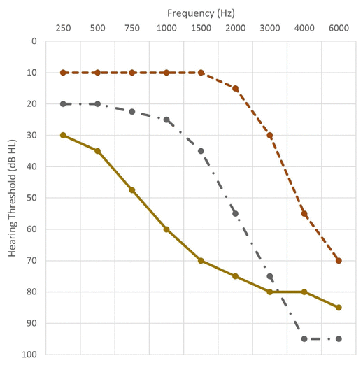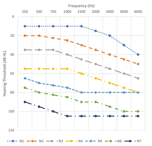 Stethoscopes’ lack of mid- and high-frequency output is particularly problematic for patients with age-related hearing loss, who experience a greater degree of loss in the high frequencies. For older adults, the high frequency sounds, including the /f/, /th/, and /s/ phonemes, are more difficult to discriminate than lower pitched vowel sounds and the sonorant consonants such as the /m/ and /r/ phonemes. This is visually demonstrated through the 10 ‘standard audiograms’ in Figures 1 and 2. These standard audiograms were developed by vector quantization of almost 30,000 audiograms from older adults with hearing loss.(28) In each of these standard hearing losses, thresholds worsen as the frequency of the test tone increases.