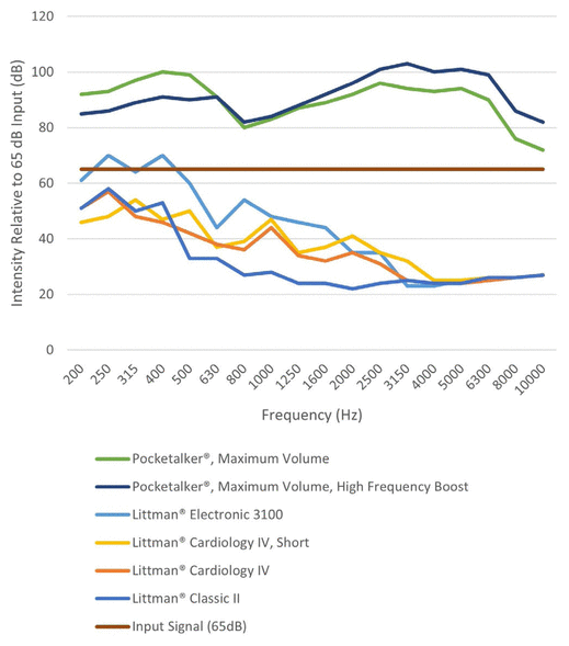 These findings are in keeping with our spectral analyses of the stethoscopes. While the Pocketalker personal amplification device provided up to 38 dB of amplification across the spectrum of frequencies, the acoustic stethoscopes attenuated the speech signal in all frequencies, and the electronic stethoscope only provided modest amplification in the lowest frequencies. The spectral output of our devices is consistent with the existing literature, which has identified resonance peaks in stethoscopes below 500 Hz, followed by a progressive attenuation of output, reaching 20 dB of attenuation of all input signals beyond 1,000 Hz.(22,23,24,32) Together, these findings support the assertion that stethoscopes are designed to transmit the low frequencies sound waves which contain internal body sounds, rather than the mid- to high-frequency sound waves which contain speech sounds.