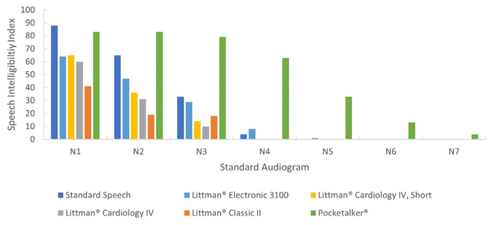 Speech signals delivered through the acoustic stethoscopes yielded poorer Speech Intelligibility Index scores than regular speech (see Figures 4 and 5). The Littmann 3100 Electronic stethoscope similarly degraded the speech intelligibility in all standard hearing losses, apart from hearing losses N4 and N5 in which it provided a near negligible 4% and 1% improvement, respectively. In contrast, the output of standardized speech presented through the Pocketalker yielded improved speech intelligibility relative to unaided standard speech in all but the mildest standardized hearing losses, as demonstrated in Figures 4 and 5. The benefit provided by the Pocketalker ranged from a 5% loss in Speech Intelligibility Index scores for hearing loss N1, the mildest hearing loss, to a 59% gain in the Speech Intelligibility Index score for N4, a moderately severe hearing loss.