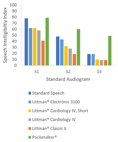 The International Speech Test Signal was presented to four Littman® stethoscope models and a Pocketalker® personal voice amplifier using an Audioscan® hearing instrument test box. The acoustic outputs of the stethoscopes and voice amplifier were measured across the frequency spectrum of speech. The Speech Intelligibility Index of the resulting speech was calculated for natural speech and for each device in relation to 10 standardized hearing losses representing the population of older adults.
