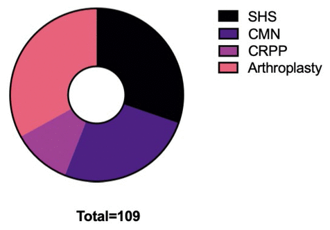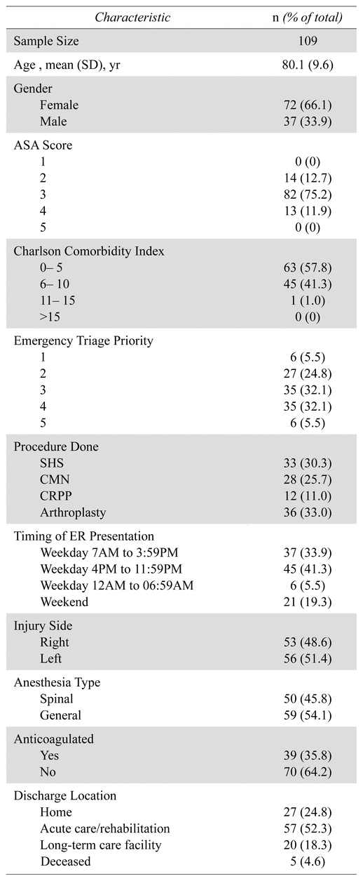One hundred and nine patients (72 females and 37 males) were included in the study. Mean age of all subjects was 80 years old. Fifty-three (48.6%) patients sustained a right hip fracture and 56 (51.4%) had a fracture of their left hip. No patient had an American Society of Anesthesiologists (ASA) classification of 1. Fourteen (12.7%) patients were classified as ASA 2; 82 (75.2%) ASA 3; 13 (11.9%) ASA 4; no patient had an ASA score of 5. As for the calculated Charlson Comorbidity Index (CCI), 63 (57.8%) of patients were classified as CCI between 0 and 5; 45 (41.3%) patients had a CCI score between 6 and 10, and 1 (1%) patient had a CCI between 11 and 15. No patient had a CCI score of more than 15. Out of the 109 patients, 39 (35.8%) patients were on oral anticoagulants at the time of presentation in the emergency room. Twenty-seven patients were discharge home (24.8%), 57 (52.3%) to a rehabilitation centre, 20 (18.3%) to a long-term care facility, and 5 (4.6%) patients died during their stay at the hospital.