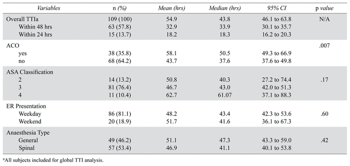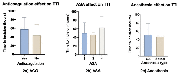 Patients on oral anticoagulants (ACO) waited an average of 58 hours (median 51) compared to 44 hours (median 38) for patients not anticoagulated ( p = .007). ASA class 2 patients waited an average of 51 hours, ASA class 3 patients waited on average 47 hours, and those with ASA class 4, 63 hours ( p = .17).