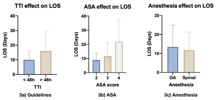 The established benchmark of a time-to-surgery of less than 48 hours was respected for 63 (57.8%) patients. Patients on oral anticoagulant (ACO) waited significantly longer, on average 58 hours compared to 44 for non-anticoagulated patients ( p = .007). Patients with higher ASA scores waited significantly longer ( p = .0018). More importantly, patients treated within 48 hours were discharged significantly earlier, on average after 10 days compared to 16 days for patients who waited more than 48 hours before receiving surgical treatment ( p = .003), regardless of the pre-operative waiting time.