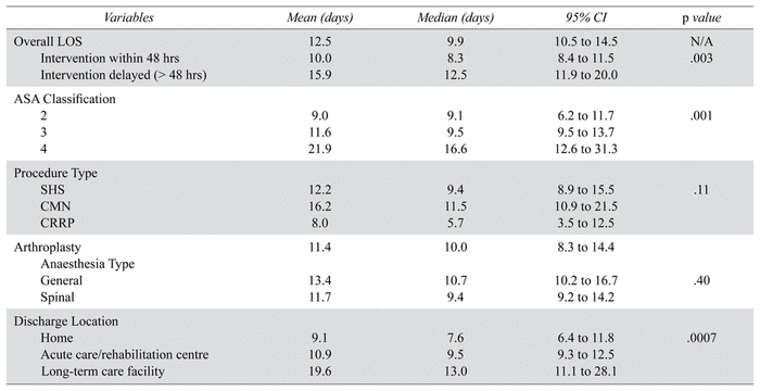 As explained in the methodology section, we defined the length-of-stay by the duration of hospitalization from the end of the surgical intervention until discharge. The overall average length of stay was 12.5 (10.5; 14.5) days, with a median of 9.9 days. A significant difference ( p = .001) was observed based on the ASA classification in relation to the length of stay (LOS). Patients with ASA 2 had a length of stay of 9.0 days; the LOS for patients with ASA class 3 was 11.6 days, and those with ASA class 4, 21.9 days. Moreover, patients treated within 48 hours were discharged significantly earlier, on average after 10.0 days compared to 15.9 days for patients who waited more than the recommended delay ( p = .003). No significant difference was observed based on the anaesthesia type and the average length of stay. Patients who were anesthetized under general anaesthesia were discharged on average 13.4 days after their intervention compared to 11.7 days for patients with spinal block ( p = .39). Finally, one-way ANOVA revealed no significant difference on the length of stay based on the procedure type ( p = .11). Patients who underwent surgical fixation with dynamic hip screw stayed in hospital on average 12.2 days after surgery; 16.2 days for patients treated with titanium fixation nail; 8.0 days for closed reduction and percutaneous pinning (CRPP); and 11.4 days for patients who underwent hip arthroplasty ( p = .11). Patients discharged home stayed on average 9.1 days in the hospital, 10.9 days for those transferred to a rehabilitation centre, and 19.6 days for patients requiring placement to a long-term care facility ( p = .0007).