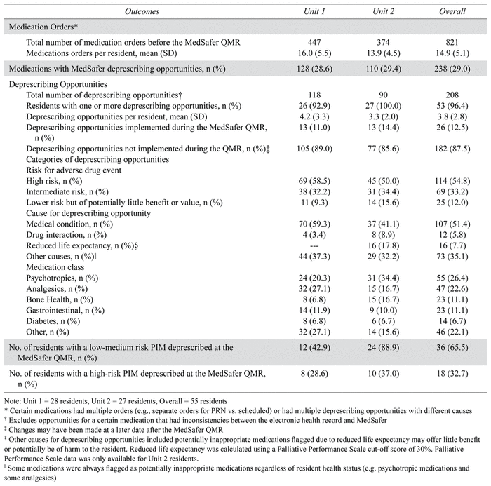 MedSafer identified deprescribing opportunities for 53 out of the 55 residents across both units (96.4%; Table 2). Commonly flagged PIMs included psychotropics and opioid analgesics for chronic non-cancer pain. Nearly a third of residents (32.7%) had a PIM deprescribed at the MedSafer QMR. The reasons for deprescribing included: 1) MedSafer identified the PIM as potentially having little added benefit (5 deprescribed/25 identified or 20.0%), 2) reduced resident life expectancy (4/16 or 25.0%), and 3) overly tight control of diabetes (6/14 or 42.9%).