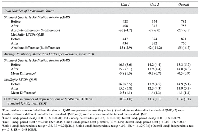 Overall, an average of 0.5 (SD = 0.9) medications per resident were deprescribed in the standard QMR and an average of 1.1 (SD = 1.3) medications per resident were deprescribed at the MedSafer QMR. In comparing deprescribing rates, there was an average of 0.5 (SD = 1.1) more medications deprescribed per resident at the MedSafer QMR than the standard QMR (p = .02 ES = 0.5 or medium effect size). On one study unit, the intervention was more effective and the MedSafer QMR resulted in a mean reduction of 1.6 (IQR = 1.0) medications per resident, while the standard QMR on that unit resulted to a mean reduction of 0.3 (IQR = 1.0) medications per resident. The mean difference of 1.4 (IQR = 1.0) more medications deprescribed at the MedSafer QMR compared to the standard QMR was significant (p < .001, ES = 1.3 or large effect size). Across the two units, there was also a larger reduction in average medication orders per resident observed at the MedSafer QMR (mean = −1.1, SD = 1.3, ES = −0.8 or large effect, IQR = 2.0) compared to the standard QMR (mean = −0.5, SD = 0.9; ES = 0.6 or moderate effect, IQR = 1.0).