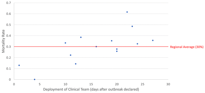 The decision to deploy our team was not random; we were generally asked to respond to larger outbreaks and/or outbreaks in facilities that were struggling with staffing. Thus, it would not be appropriate to assess the effectiveness of our team by comparing outcomes in facilities where we were deployed to those where we were not deployed. Instead, we used Pearson’s r test to compare the mortality rate of outbreaks at each facility based on the delay between the declaration of the outbreak and the deployment of the clinical team. Statistical comparisons were performed using StatPlus:mac v7.3.32 (AnalystSoft, Walnut, CA).