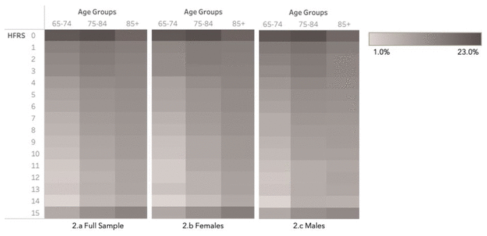 FIGURE 1 Distribution of HFRS among hospitalized older adults in New Brunswick by full sample (2a), females (2b), males (2c). | ||