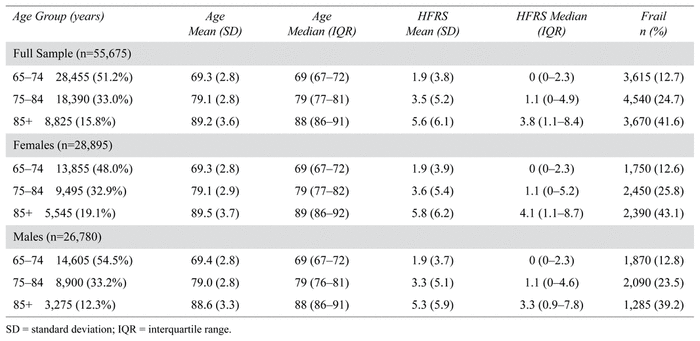 The distribution of frailty is in line with that reported in other jurisdictions. We demonstrate the feasibility of the HFRS to identify and characterize frailty in a large sample of older adults who were hospitalized, using administrative data.