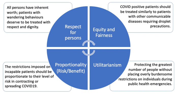 We identified the pertinent medical, ethical, and legal factors involved when caring for incapable wandering patients at risk of contracting or spreading COVID-19. Caring for such patients can be morally distressing to health-care workers when core ethical principles of medical practice—autonomy, fiduciary duty, beneficence, and non-maleficence—conflict with pandemic ethics of utilitarianism. Recognizing the ethical dilemma is integral to understanding why clinicians feel moral distress. Added to this complicated picture are the medical considerations of wandering patients who are often at risk for serious complications from COVID-19 due to age and medical comorbidities, but who are at increased risk of harm associated with chemical and physical restraints. The findings of the interdisciplinary working group were incorporated into our institution’s hospital policy on restraint use as an addendum to the existing policy; it now sets the standard of care for practitioners at our institution. These findings have been synthesized into a decision-support framework (Figure 2) to help clinicians navigate cases at their own institutions.(19,20)