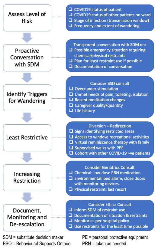 A literature search identified very few papers relevant to the medical care of wandering patients in the context of COVID-19, of which most were reviews or policy documents. Provincial public health guidelines identified the need to follow IPAC measures to limit the spread of communicable diseases,(4,8) which is challenging in patients with dementia who may not remember or follow instructions. Generally, best practices to curtail wandering patients begin with a thorough assessment identifying any modifiable triggers for wandering.(3) Non-pharmacological strategies must be exhausted before considering chemical and physical restraints.(3,9,10) However, there has been a statistically significant increased use of antipsychotics and benzodiazepines since the onset of the COVID-19 pandemic, both locally in Ontario(11) and globally.(12,13) Use of restraints has been associated with increased delirium,(14) adverse events in nursing homes,(15) and COVID-19 mortality.(16) The available recommendations ultimately highlight the need for a combined principles-based and context-based approach to each individual’s care,(9) but no practical approach exists to support clinical decision-making.