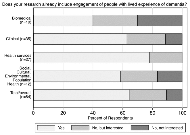These findings support an optimistic outlook for engaging people with lived experience of dementia in research, but identify differences across research themes. Understanding approaches to incorporate, evaluate, and adapt engagement activities across research disciplines are needed to enable researchers, as well as others involved in research, to develop and target strategies for patient and public involvement/engagement in research on dementia.