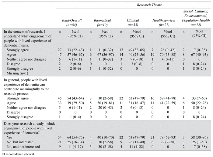 Patient and public involvement/engagement in research on dementia is not new, but it is becoming increasingly common. The objective of this study was to describe researchers’ knowledge, attitudes, and activities related to engaging people with lived experience of dementia in research, and how these differ by research theme.
