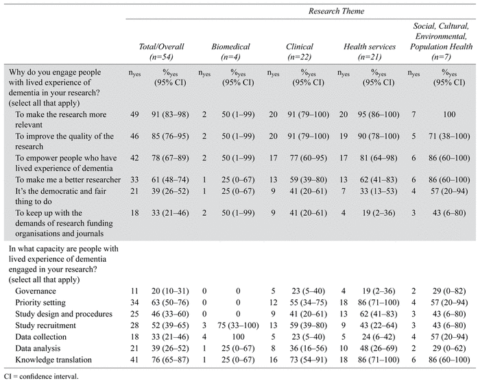 Table 2 Researcher self-reported reasons for and capacity in which they engage persons with lived experience of dementia in research, overall and stratified by research theme
