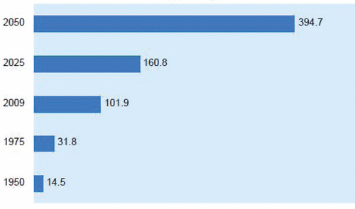 FIGURE 1. Actual and projected population aged 80 or over in the world from 1950–2050 Data from United Nations.(4) |