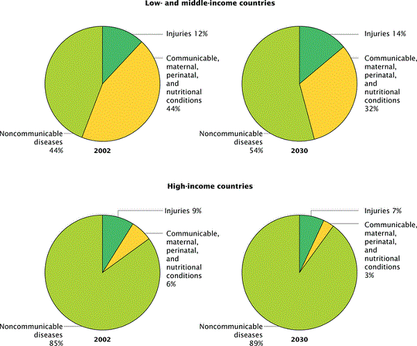 This epidemiological transition is rapid and widespread.(2,3) It is estimated that in the year 2030, chronic noncommunicable diseases will be responsible for more than half of the disease burden in lower-middle and low-income countries(12) (Figure 2). However, the rate of transition and disease patterns across countries are influenced by several country-specific historical, socioeconomic, and biological factors such as war, famine, education, economic growth, and genetic susceptibility to particular diseases.(13) Furthermore, while in developed countries there has been a clear shift from early transition diseases (i.e., infections and malnutrition) to late transition diseases (e.g., cardiovascular disease, diabetes), many developing countries face a “double burden of disease”, where both conditions coexist in the population.