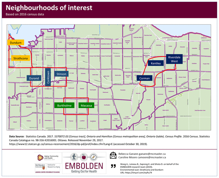 While environmental scans have been used in health research and other contexts, we extend the methodology. Importantly, the environmental scan developed for the EMBOLDEN project was informed by the social determinants of health and divided into three phases. Each phase informs the next and uses a mix of publicly available data, key informant descriptions, on-the-ground verification using windshield surveys, and consultation with our Strategic Guiding Council (SGC) to validate the accuracy of information. SGC membership includes representatives from the City of Hamilton, Hamilton Public Health Services, Hamilton Council on Aging, older adult citizens from priority neighbourhoods, and other community partners. The process was iterative in that new information, such as the impact of COVID-19 on community resources, would be integrated into the neighbourhood profiles. Phase I and II dealt with Hamilton generally, and Phase III focused on the priority neighbourhoods identified during the first two phases.