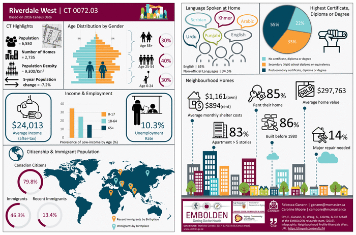 Based upon the analysis of census tract data, eight priority neighbourhoods that met the aforementioned criteria were identified (see Figure 1). These neighbourhoods included Strathcona/Dundurn, Durand, Corktown/Stinson, Burkholme, Macassa, Corman, Kentley, and Riverdale West. Infographics were used to visually highlight population structure, income and employment, citizenship and immigration, education profiles, and housing characteristics in each area (Figure 2).