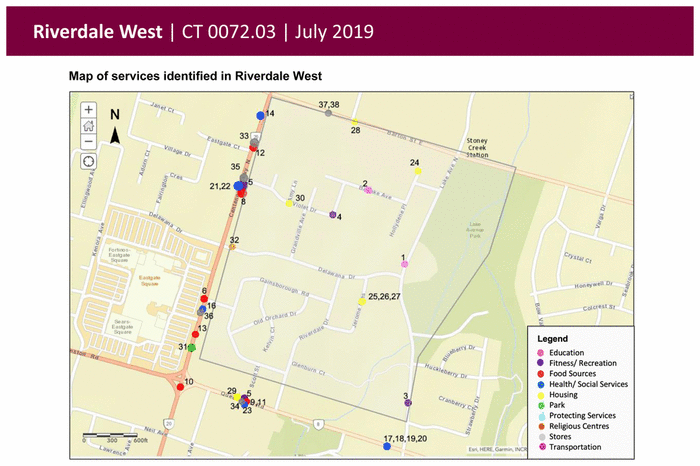 The completed windshield surveys were used to develop maps, narratives, and summary tables of services and programs available in each neighbourhood. For example, Figures 3a and 3b illustrate the findings associated with the Riverdale West neighbourhood.