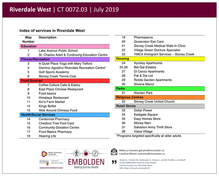 While the team drew upon various resources during the environmental scan, it was recognized that the scan would miss some services in each neighbourhood, particularly small-scale or grassroots organizations and services. However, the environmental scan provided an overall summary of the resources in each neighbourhood and provided documents that could be used to initiate additional discussions with community partners that would uncover missing resources. Three additional limitations are noted. First, it is recognized that the landscape of service providers will shift over time as funding or needs change. The Age Friendly Hamilton Community Resources for Older Adults(21) was published in 2017, and resources may have changed in the intervening years. Although team members tried to reach representatives identified in Phase I at least twice by phone, they could only connect to representatives from 58 of 98 programs. The lack of connection by phone highlights potential challenges that older adults could face if they tried to access information about services by phone. Second, the windshield surveys could not be assumed to identify all resources in a community but sharing the results with community partners again helped identify gaps. Third, the weather and timing (both seasonal and daily) would affect the windshield survey outcomes, such as the number or presence of pedestrians or the use of greenspace and parks.