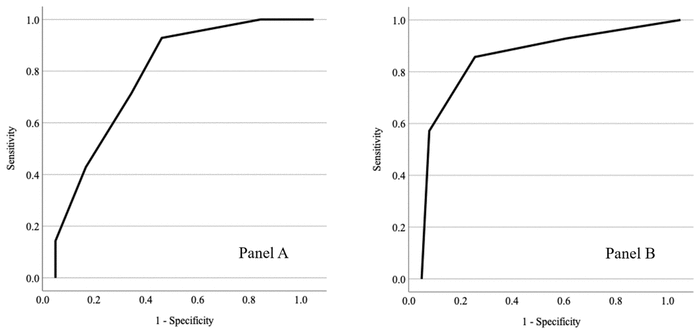 FIGURE 1 Receiver operating characteristic curve (ROC) for baseline scores on the eight-item (Panel A) and three-item (Panel B) Montreal Parkinson Risk of Dementia Scale (MoPaRDS) discriminating Parkinson’s Disease with Incipient Dementia (PDID) from Parkinson’s Disease with No Dementia (PDND). For the eight-item MoPaRDS, area under the ROC curve (AUC) is 0.81 (95% confidence interval [CI] = 0.68–0.93; p = .001). For the three-item MoPaRDS, AUC is 0.88 (95% CI = 0.68–0.93; p = .001). | ||