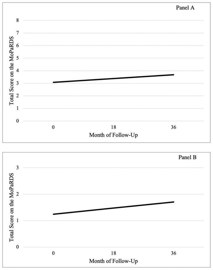 FIGURE 2 Predicted growth curve model for overall risk scores on the eight-item (Panel A) and three-item (Panel B) Montreal Parkinson Risk of Dementia Scale (MoPaRDS). Baseline overall risk scores on the eight-item MoPaRDS statistically differed across participants (σ̂2 = 1.65, p < .001). Overall risk scores on the eight-item MoPaRDS increased across the three waves (M increase per wave = 0.30, p = .002). Baseline overall risk scores on the three-item MoPaRDS statistically differed across participants (σ̂2 = 0.70, p < .001). Overall risk scores on the three-item MoPaRDS increased across the three waves (M increase per wave = 0.23, p < .001). | ||