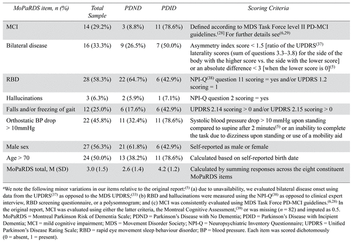 We assembled data for 48 PD patients (Mage = 71.6 years; SD = 4.8; 56% male) who were (a) missing no baseline data across the individual MoPaRDS items or education; (b) non-demented at baseline; and (c) evaluated for dementia at the third and final wave of participation. As detailed elsewhere,(6,8,10) dementia diagnoses were determined by an experienced clinician using the prevailing diagnostic criteria. Briefly, participants were diagnosed with PDD if they presented with (a) impairment in two cognitive domains and (b) functional impairment. Diagnoses were based on: (a)clinical assessment; (b) independent PD patient andinformant interviews; (c) Clinical Dementia Rating Scale;(14)(d)Standardized Mini-Mental Status Examination;(15) (e)Dementia Rating Scale;(16) and (f) Short Blessed Information-Memory-Concentration Test.(17) Fourteen participants (29.2%)had developed dementia at Wave 3 and were retroactivelyclassified at baseline as PD with Incipient Dementia (PDID).The remaining participants (n = 34; 70.8%) did not developdementia and were retroactively classified as PD with NoDementia (PDND).