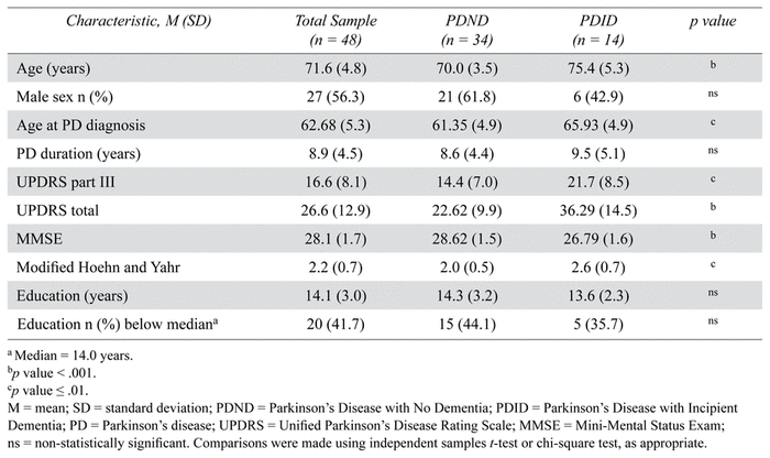 Participants were 48 initially non-demented PD patients (Mage = 71.6 years, range = 65–84) from a three-year, three-wave prospective Canadian cohort study. A dementia diagnosis at Wave 3 was used to stratify two baseline groups: PD with Incipient Dementia (PDID) and PD with No Dementia (PDND). We aimed to predict dementia three years prior to diagnosis using baseline data for eight indicators that harmonized with the original report, plus education.