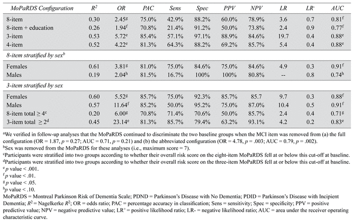 We evaluated these research directions with harmonized longitudinal data from a three-wave (three-year) study of a well-characterized(6–13) Western Canadian cohort of geriatric (aged 65+) PD patients. Five research goals (RG) were stipulated. For RG1, we examined whether two subgroups of an initially non-demented cohort of persons with PD (i.e., those who later converted to PDD and those who remained dementia free) were independently discriminated by baseline values for (a) each of the eight constituent MoPaRDS items, and (b) education. Because not all clinics or research cohorts will have access to all eight of the MoPaRDS items, for RG2 we examined predictive validity of overall risk scores on three alternative configurations: (a) the full (eight-item) MoPaRDS; (b)the full MoPaRDS plus education; and (c) an empiricallyderived abbreviated configuration. For RG3, we exploredwhether prediction patterns of overall risk scores varied across sex. For RG4, we determined the optimal cut-off points for apositive screen result. For RG5, we examined change trajectories of overall risk scores across the three waves.