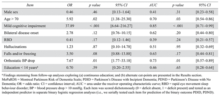 We used baseline data to test whether each of the constituent MoPaRDS item independently discriminated PDID from PDND. Detailed results are presented in Appendix B. Findings showed that the two groups were discriminated by three of the eight MoPaRDS items: age (odds ratio [OR] = 5.92; 95% confidence interval [CI] = 1.38–25.30; p = .02); MCI (OR = 37.89; 95% CI = 6.64–216.27; p < .001); and orthostatic hypotension (OR = 7.67; 95% CI = 1.77–33.18; p = .01). There was a trend for falls and/or freezing (OR = 3.50; 95% CI = 0.88–13.88; p = .08). Education did not independently discriminate PDID from PDND (OR = 0.70; 95% CI = 0.20–2.55; p = .59). We conducted a series of follow-up analyses in which we verified that education did not independently discriminate the groups when (a) tested as a continuous variable (OR = 0.92; 95% CI = 0.73–1.15; p = .46); (b) dichotomized using a cut-point of 12 years of formal education (n below this threshold = 7; OR = 0.97; 95% CI = 0.16–5.69; p = .97); and (c) dichotomized using a cut-point of > 1SD below the mean (11 years of formal education; n below this threshold = 5; OR = 1.72; 95% CI = 0.26–11.62; p = .58).