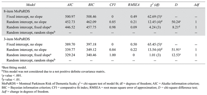 We established the functional form of change for the Montreal Parkinson Risk of Dementia Scale (MoPaRDS) using growth curve models.(21,22) We identified the best-fitting model by testing the following four models in sequence: (a) fixed intercept (no slope) model, which assumes that there is no variability between or within persons; (b) random intercept (no slope) model, which allows for variability across persons in overall level but assumes no intraindividual change; (c) random intercept, fixed slope model, which allows for variability across persons in level but assumes that each person changes at the same rate; and (d) random intercept, random slope model, which allows for variability across persons in both level and change.(22) We compared each successive model using the chi-square difference test. This statistic is interpreted such that positive values indicate that the less restrictive model provides a better fit to the data relative to the preceding, more restrictive model.
