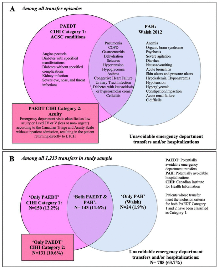 Assessment of transfer avoidability was conducted using definitions proposed by CIHI,(23) Walsh et al.,(24) and Walker et al.(12) In Figure 1A, we present a Venn diagram describing conditions included when considering PAEDT and PAH definitions, and the degree to which they overlap. We chose CIHI’s PAEDT definition(22) for our primary analysis that includes visits “for selected potentially preventable conditions—similar to ambulatory care sensitive conditions and validated for LTC home residents—for which timely primary care management could have been effective” (CIHI Category 1),(22) and visits classified as being “Less Urgent” or “Non Urgent” (low acuity) according to the Canadian Emergency Department Triage and Acuity Scale,(25) and “without inpatient admission, resulting in the patient returning directly to LTC home” (CIHI Category 2).(22) Category 1 PAEDTs were identified using principal ED diagnoses, while Category 2 PAEDTs were identified using the triage code and ED disposition for each transfer episode.(22) To measure PAHs, we used the Walsh et al. definition, which includes a list of conditions validated for the LTC population and distinguishes between conditions that are ‘manageable’ and ‘preventable’ in the LTC setting.(24)
