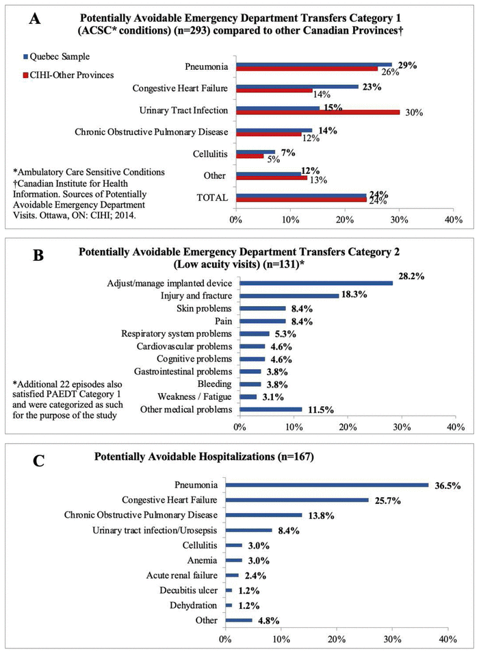 If the goal is to effect change, it is necessary to target the source and examine relevant outcomes. For instance, we found fewer urinary tract infection-related PAEDT Category 1 transfers in Quebec compared with those in the rest of Canada, which may indicate some locally established best practices. In contrast, the frequency of transfers attributable to implanted device malfunction was particularly notable in our sample. Though this finding may indicate an area for local LTC improvement, without further details, it is hard to know whether this was due to higher prevalence of using such devices or the achievability of ‘fixes’ outside the hospital setting. In the rest of Canada, falls was the most frequent condition, accounting for 25% of all PAEDT Category 2 transfers.(22) In our dataset, the “injury and fracture” category captured conditions such as head injury, joint dislocations, and bone fractures, for which the underlying reasons might have been falls.