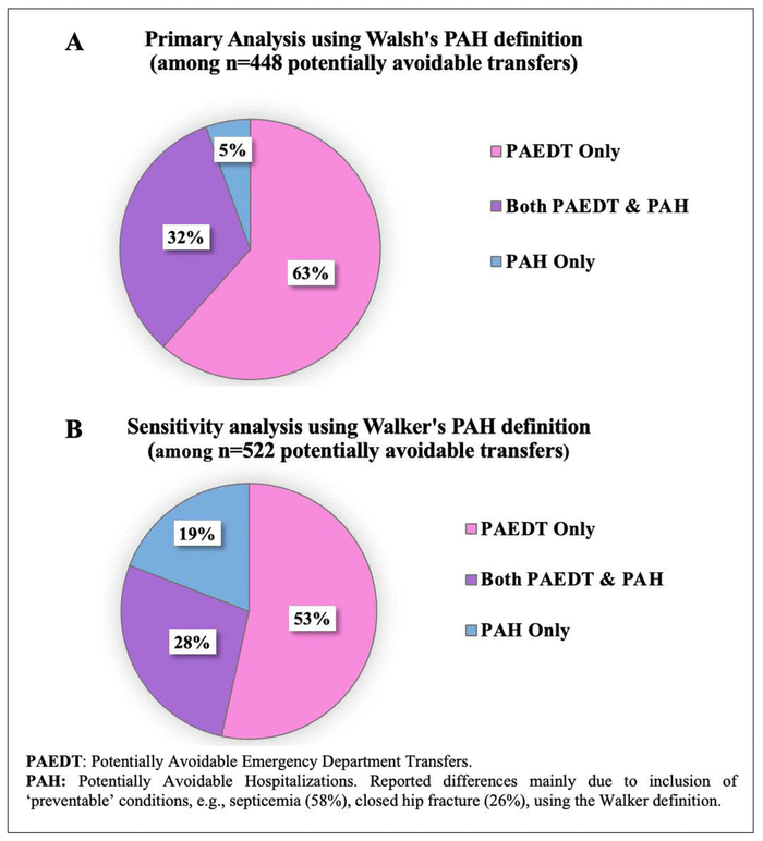 Figure 3 presents the contribution of PAEDTs and PAHs within the subset of potentially avoidable acute care transfer episodes. When using our primary analysis Walsh PAH definition (Figure 3A), the PAEDT outcome measure was dominant, as it captured, in total, about 95% of all potentially avoidable transfers, whereas in our sensitivity analysis using Walker’s definition (Figure 3B), PAEDTs captured 81%. The PAH measure captured 37% and 47% of all potentially avoidable transfers when using the Walsh vs. Walker definitions, respectively. These differences occurred mostly due to the inclusion of septicemia and closed hip fracture (which are ‘preventable’ as opposed to ‘manageable’ conditions in the Walker definition).