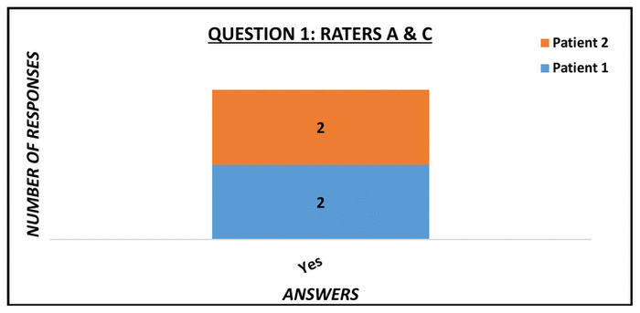Figure 1 Participant answers to question 1 between raters A & CThe stacked bar chart shows each participant response to question 1, obtained during the decision-making capacity assessments done with the communication aid by raters A and C. | ||