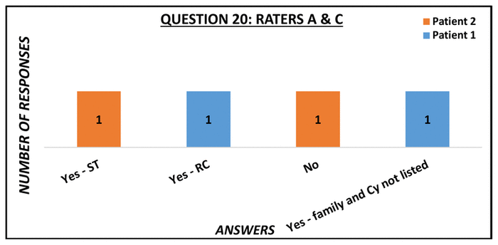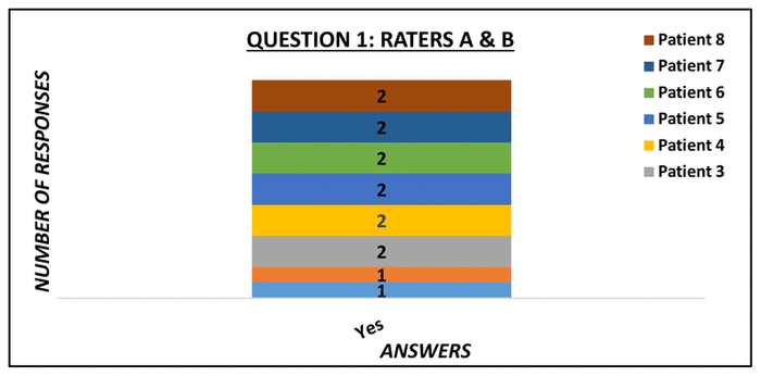 Figure 2 Participant answers to question 1 between raters A & BThe stacked bar chart shows each participant response to question 1, obtained during the decision-making capacity assessments done with the communication aid by raters A and B. | ||