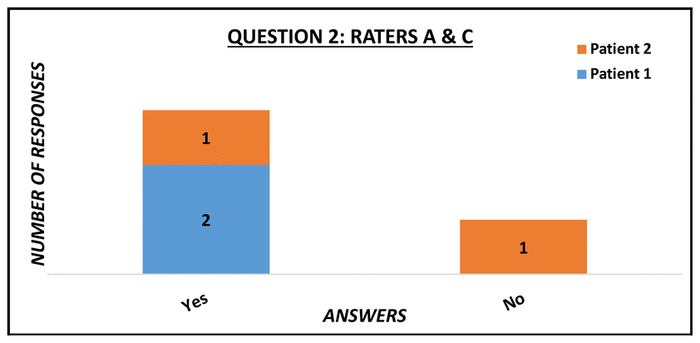 Figure 3 Participant answers to question 2 between raters A & CThe stacked bar chart shows each participant response to question 2, obtained during the decision-making capacity assessments done with the communication aid by raters A and C. | ||