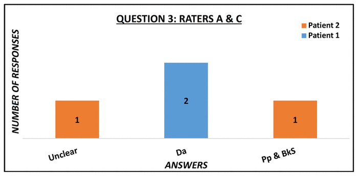 Figure 5 Participant answers to question 3 between raters A & CThe stacked bar chart shows each participant response to question 3, obtained during the decision-making capacity assessments done with the communication aid by raters A and C. Abbreviations: Pp – pension plan; Da – disability allowance; BkS – bank savings. | ||