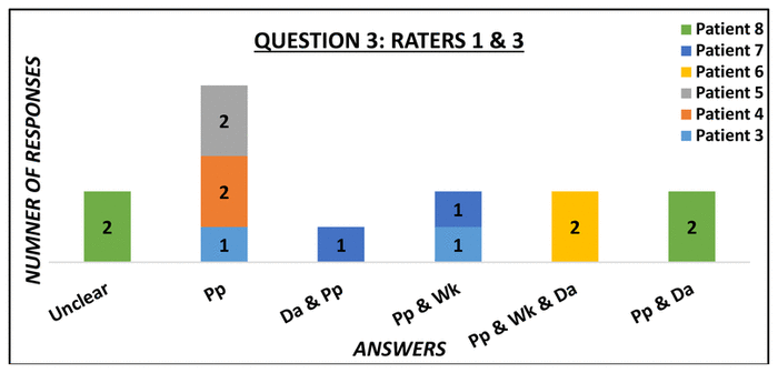 Figure 6 Participant answers to question 3 between raters A & BThe stacked bar chart shows each participant response to question 3, obtained during the decision-making capacity assessments done with the communication aid by raters A and B. Abbreviations: Pp – pension plan; Da – disability allowance; Wk – work; BkS – bank savings. | ||