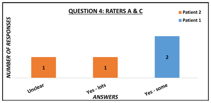 Figure 7 Participant answers to question 4 between raters A & CThe stacked bar chart shows each participant response to question 4, obtained during the decision-making capacity assessments done with the communication aid by raters A and C. | ||