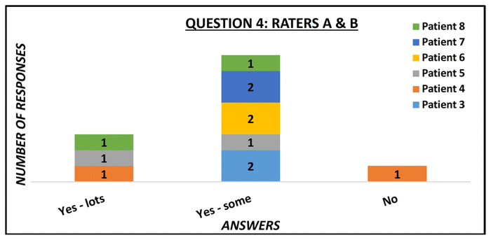 Figure 8 Participant answers to question 4 between raters A & BThe stacked bar chart shows each participant response to question 4, obtained during the decision-making capacity assessments done with the communication aid by raters A and B. | ||